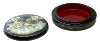 The box is made out of paper-mache. The interior of the box is red, while the exterior is covered with back lacquer. The lid is not hinged, and the box rests on a flat bottom.
