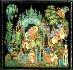 Description: This splendid box has been painted by Kornilova Natalie from the village of Palekh. Its subject is based on the thrilling Russian fairy-tale "The Apples of Youth and the Water of Life".