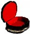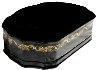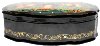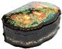 The box is made out of paper-mache. Black lacquer covers the exterior and red lacquer covers the interior of the box. The lid is hinged from the top of the scenes, and the box rests on a flat bottom. The work is signed on the top with the artists names and the village of Palekh.
