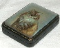 The box is constructed from paper-mache. Black lacquer is used to paint the exterior of the box while red lacquer completes the interior of the work. A hinge is fastened to the left of the scene, and the box rests on a flat bottom.