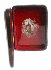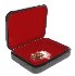 The sides of a box are imitates the color of a brown marble. The box's exterior is black, while the box's interior is red.