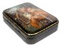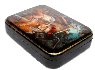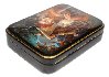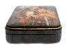 The box is constructed from paper-mache. A hinge is fastened to the left of the composition , and the box rests flat. The work is signed with the year of 2016, Fedoskino, and the author B.Shavirin.