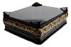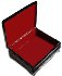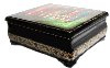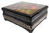 The box is constructed from paper-mache. Black lacquer is used to paint the exterior of the box while red lacquer completes the interior of the work.
