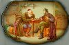 Description: This elegantly shaped box is a creation of the talented Fedoskino painter, Lubov Krasnoslobodtseva. It depicts a couple Jewish guys amusing themselves with a chess game. One of them is smoking a cigarette, the other is just leaned his head on his arm while thinking.