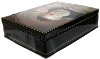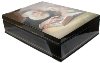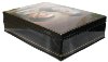 Sides of the box are decorated with two golden parallel lines. A hinge is fastened to the left of the portrait, and the box rests on a flat bottom. The work is signed with the artist's name.