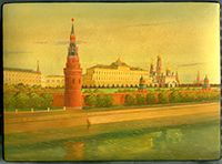 Description: This gorgeous box was painted by a talented artist Tsvetkov from the village of Fedoskino. It depicts a picturesque view of the Moscow Kremlin from bank on the other side of Moscow river.