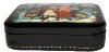 The box is constructed from paper-mache. The exterior of the box is painted with black lacquer while the interior is completed with red lacquer.