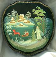 The work is a good example of intricate Palekh art. The greens and blues colors become electric, the reds and oranges are passionate.