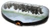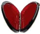 The box is constructed from paper-mache. Black lacquer is used to paint the exterior of the work while red lacquer completes the interior of the box. The lid is hinged from the bottom of the composition. The box rests flat. The work is signed by the artist in brown oils at the bottom of the composition.