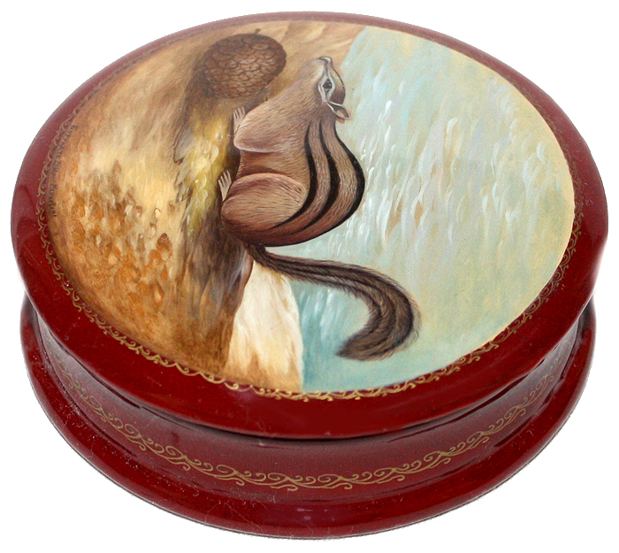 Description: Mashkova Marie of Fedoskino created this splendid box that features a ground squirrel or chipmunk. It is one more box from the artist's animal series. The chipmunk is painted with photo quality accuracy in the realistic style!