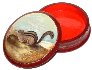 The box is constructed from paper-mache. Dark red lacquer is used to paint the exterior of the box while bright red lacquer completes the interior of the work. The lid isn't hinged and the box rests on a flat bottom. The work is signed with the artist's name and the name of the animal.