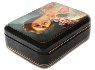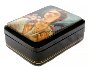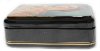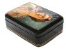 The scene is framed with a thin gold line.Two parallel gold lines are decorated the sides of the box. The box's exterior is painted black and the interior is red.