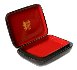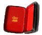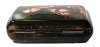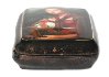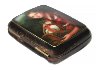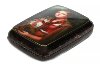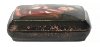 The scene is framed with a gold line. The black lacquered exterior of the box is covered with gold blurry spots to make the box look appealing. The interior is traditionally red. The Fedoskino "troika" insignia can be found on the interior of the lid.