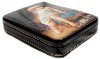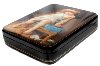The box is constructed from paper-mache. Black lacquer is used to paint the exterior of the box while red lacquer completes the interior of the work. The lid is hinged from the left of the scene, and the box rests on four legs. The work is signed with the artist's name.