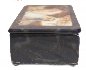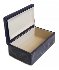 The box is constructed out of paper-mache. Dark blue lacquer covers the exterior and cream gray lacquer covers the interior of the box. The box has a hinge to its top and rests on four rounded metal legs. The work is signed with the artist's name on the right side of the lid.