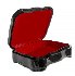 The box is constructed from paper-mache. Black lacquer is used to paint the exterior of the box while red lacquer completes the interior of the work. A hinge is fastened to the top of the composition, and the box rests on four legs. The work is signed with the artist's name, Fedoskino and 2020.