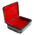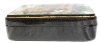 The box is constructed from paper-mache. Black lacquer is used to paint the exterior of the box while red lacquer completes the interior of the work. The lid is hinged from the left of the composition, and the box rests flat.