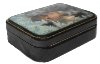 The box is constructed of paper-mache. The lid is hinged from the left from the scene, and the box rests on a flat bottom. The work is signed in black paint with the artist's name and name of a village of Fedoskino.