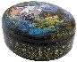 The artist places the focal point of the composition in the center of the dome shaped lid. This truly gives the impression of the Snow Queen in the midst of rapid flight. The town is painted in the background and seems that it is located below the clouds. Cool tones of blue and turquoise dominate the composition. Aluminum powder creates glistening of the snow, highlights the bodies of fantastically beautiful blue steeds and details other elements of the composition. Gold paint details the foliage of the trees depicted from the left and right of the composition. Divine imagination.