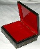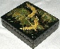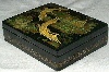 The box is constructed from paper-mache. Black lacquer is used to paint the exterior of the piece while red lacquer completes the interior of the box. The box's sides are decorated with rolling golden filigree accented with aluminum. The lid is hinged from the top of the scene, and the box rests on a flat bottom.