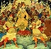 The composition shows the clue moment from this story. Kalashnikov and Kiribeevich start a boxing match. The reason of it is Kalashnikov's wife, Alyona Dmitrievna, whom Kiribeevich tried to tempt. Between them sits the Tsar Ivan Vasilievich, called Ivan the Terrible.