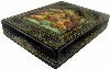 Description: This piece entitled "The Song about young Merchant Kalashnikov, the Servant of Tsar Ivan Vasilievich," was painted by the famous Kholui artist Sergey Devyatkin. His style is one of the most recognizable in the world of lacquer art. His flowing designs and patterns have a machine quality precision and he stylizes his work in the icon painting style. The blend of his creative power and the ancient techniques of icon painters has made his work something special to the art world.
