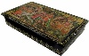 The box is constructed from paper-mache. Black lacquer is used to paint the exterior of the box while red lacquer completes the interior of the work. The box's sides and lid are decorated with beautiful patterns painted in gold and aluminum. The box is hinged, and rests on four legs. It is signed with the artist's name, the title, and the village of Kholui.