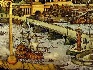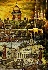 The composition looks strikingly decorative because Dmitriev has used here many supplementary materials such as gold metal foil, gold paints and aluminum powder. Gold metal leaf has been used to paint the angel and the cross to which it is attached as well as to paint the images of flying ribbons depicted in the upper and low portions of the composition, the burning sunset masterfully reproduced in the background, and some of the roofs that reflect the gilded sunrays. Gold paint is used to detail the architecture and the ships, while aluminum powder is abundantly used to paint the river and to detail some of the compositional elements but in minimal amounts.
