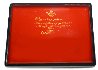 The box is constructed from papier-mache. Black lacquer is used to paint the exterior of the piece while red lacquer completes the interior of the box. The lid is not hinged, and the box rests on four round legs. The work is signed with the artist's name, date (2000), Kholui and the title on the lid's interior and at the bottom of the composition.
