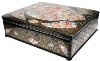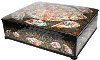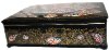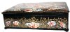 Golden beads, painted in various sizes, frame around the lid's artistry. The sides of the box are decorated with beautiful and complex floral ornamentation painted in gold and aluminum and has painting parts as well.