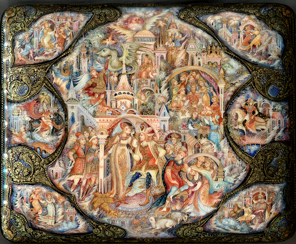 Description: Rybakov Alexander is the talented Kholuy artist responsible for the delightful assembly of color and design before you. Delicious detail, stunning decoration and a rather sublime palette make this composition quality in the highest degree. Here the artist has chosen to depict several scenes from the legendary tale "Crystal Mountain".