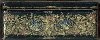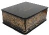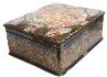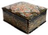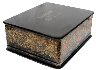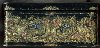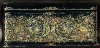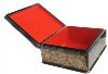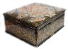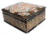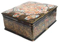 The box is constructed from paper-mache. Black lacquer is used to paint the exterior of the piece while radiant red lacquer completes the interior of the work. A hinge has been fastened to the top of the composition. The lid's composition has been framed with a thin string of golden beads that reflects nicely in the golden contours within the composition. Gold floral ornamentation, with aluminum accents, wraps around the sides of the box. The artist has written the title, Kholuy and his name at the exterior of base of the box.