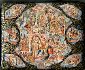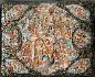 The artist uses a wide range of colors from his palette, which makes this piece come to life. Gold paint is used to highlight the scene, but is limned on in such a manner that it provides the palette with extra flair.