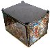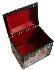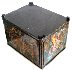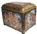 The casket is made out of paper-mache. Red lacquer covers the interior of the box and black lacquer is used to paint the exterior. The lid is hinged at top, and the box rests on legs. The work is signed with the artists names and the title at the botoom on the front side.