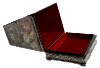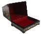 The casket's exterior and interior are covered with red lacquer. The casket has a hinge, and the box rests on the four legs.