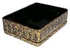 The box is made out of paper-mache, and has a hinge from the top of the composition and rests flat. Black lacquer covers its exterior and red lacquer covers its interior. Signed by the artist with their names and Kholui, titled in gold paints under the composition.