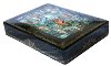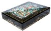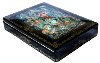The box is constructed from papier-mache. Black lacquer is used to paint the exterior of the box while red lacquer completes the interior. The box's sides are adorned with an elaborate gold leafy pattern. A hinge is fastened to the left of the composition, and the box rests on four legs. The work is signed with the artist's name, village of Kholui, the title and the year of 2018.