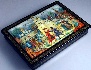 The box is constructed from paper-mache. Black lacquer is used to paint the exterior of the piece while light red lacquer completes the interior of the work. Gold ornamentation, with a floral pattern, frames the scene and wraps around the sides of the box. The box has a hinge above the composition and rests on a flat bottom. Itis signed with the artist's name, village, and title. Attractive, traditional Mstera work!