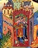 The architecture in the two kingdoms is bold and full of imagination. The palace in prince Gvidon's kingdom is painted in warm mediterranian tones and ornamented with mozaic and tiles. Strunin has used soft blended strokes to create the impression of plaster moldings and beveling. Tsar Saltan's kingdom is a medieval style, with high, protective walls and golden spires.