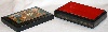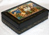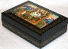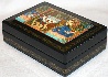 The box is made out of paper-mache made in Mstera. Black lacquer covers the exterior and red lacquer the interior of the box. Gold ornamentation accented with silver flowers frames the composition and runs around the sides of the box. It has no hinge and rests on a flat bottom. The work is signed and titled by the artist.