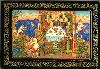 Tatyana Strunina of Mstera painted this bright composition. Using egg-tempera paints she weaves a fabulous visual tale from one of Russia's great fairy tales. Her palette uses a diverse mixture of colors that complement each other on the scene. She paints the composition according to icon painting principles that allow artists to disregard time, and most importantly space. The manipulation of the composition from a spatial point of view, shows a tightly framed scene in which three areas that in reality are very far away. She uses gold paint to accent the composition and make a viewer want to be attracted to it. Every detail is delicately manipulated for a great overall effect.