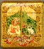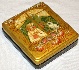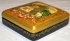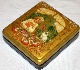 The scene is painted in red, green and white tones against the gold background. This gold background extends on the lid's sides, while the sides of the box's body are decorated with elegant gold ornamentation. The square shape of the box suits perfectly to a chosen theme.