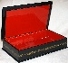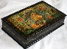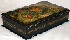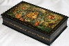 The box is constructed from paper-mache. Black lacquer is used to paint the exterior of the piece while red lacquer completes its the interior. A hinge has been fastened to the top of the composition and the box rests on four small rounded legs. The titled, the word 'Mstera' and the artist's name can be found just under the composition. Beautifully done!