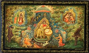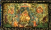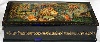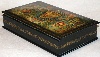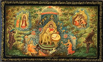 Description: Lidia Demidova of Mstera is the artist who created this work called "Pergola of Tales". In the middle of the box we can see Alexander Pushkin sitting inside the pergola and writing his thrilling tales. His figure is also drawn in the left and right bottom corners. The rest part of entire composition is filled with various characters created by the great Russian poet. In the left upper corner we can see the Shemakha Queen coming out of her eastern tent, and Tsar Dadon proposing marriage to her ("The Tale of Golden Cockerel"). While in the right upper corner the old fisherman and his wife sit inside their hovel near a cracked washtub (it's the very beginning of "The Tale of Old Fisherman and Magic Fish"). At the bottom of the composition there are characters from "The Tale of Sleeping Princess and Seven Bogatyrs" - the wicked Queen with her magic mirror, the Queen's servant holding the poisoned apple, and the dog trying to protect the Sleeping Princess who isn't depicted here. Just above Pushkin's arm-chair there are thirty-three knights and the Princess Swan from "The Tale of Tsar Saltan".