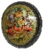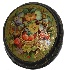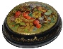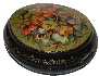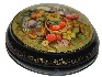 Description: This small, attractive box is a creation of Olga Strunina from the village of Mstera. In the center of the box's lid the artist has painted the basket filled with fresh ripe strawberries and encompassed this image with beautiful flowers, bees and butterflies. The composition is painted in soft tempera paints against the olive background. Each minute detail is richly enhanced in brilliant gold paint. The composition is framed with a simple gold pattern while the edges of the lid are adorned with more complex floral design also painted in gold.