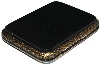 The box is constructed from paper-mache. The exterior of the box is painted with black lacquer while the interior is completed with dark red lacquer. The lid is hinged at top, and the box rests on a flat bottom. The work is signed with the artist's name, the title and the village of Mstera.