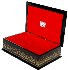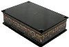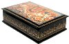 The box is constructed from paper-mache. Black lacquer is used to paint the exterior of the piece while red lacquer completes the interior of the box. The box's exterior sides are decorated with intricate gold and aluminum ornamentation. A hinge has been fastened along the top of the composition and the box rests on a flat bottom. The work is signed and titled by the author.