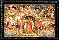 The subject is based on the popular fairy-tale "Tale of Tsar Saltan", written by famous Russian poet Alexander Pushkin. Several scenes depicted here features different moments of the tale including the beginning, the middle part and the end. The left upper corner shows the beginning of the tale: