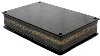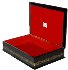 The box is constructed from paper-mache. Black lacquer is used to paint the exterior of the piece while red lacquer completes the interior of the box. The box's sides are decorated with intricate gold and aluminum ornamentation. A hinge has been fastened along the top of the composition and the box rests on the four small round legs. The work is signed and titled by the author.