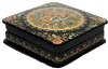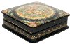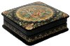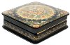 The box is made out of paper-mache. Black lacquer covers the exterior and red lacquer covers the interior of the box. The lid is hinged from the top of the composition, and the box rests on four rounded legs. Signed with the name of the artist, the village of Mstera and the title on the exterior's bottom.
